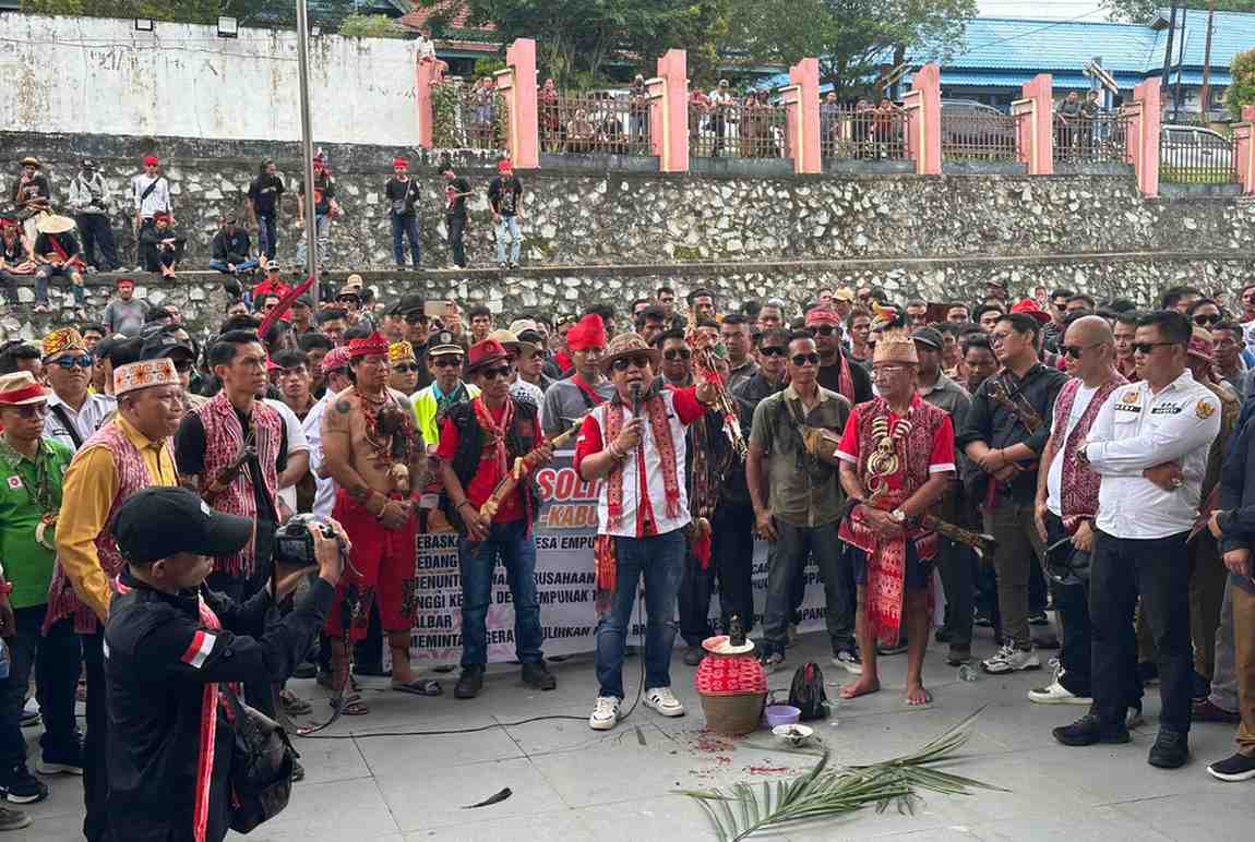 SINTANG – Berkisar 800-an peserta aksi yang terdiri dari Kepala Desa, Mahasiswa, dan masyarakat perwakilan dari 14 Kecamatan di Sintang mendatangi DPRD Kabupaten Sintang demi meminta dibebaskannya Kades Empunak Tapang Keladan, Aidi Tinggi yang ditahan oleh Kapolda Kalbar. Aidi ditahan pada tanggal 13 Desember 2024 atas laporan PT. Kiara Sawit Abadi dengan tuduhan pencurian limbah Miko (Minyak Kotor).